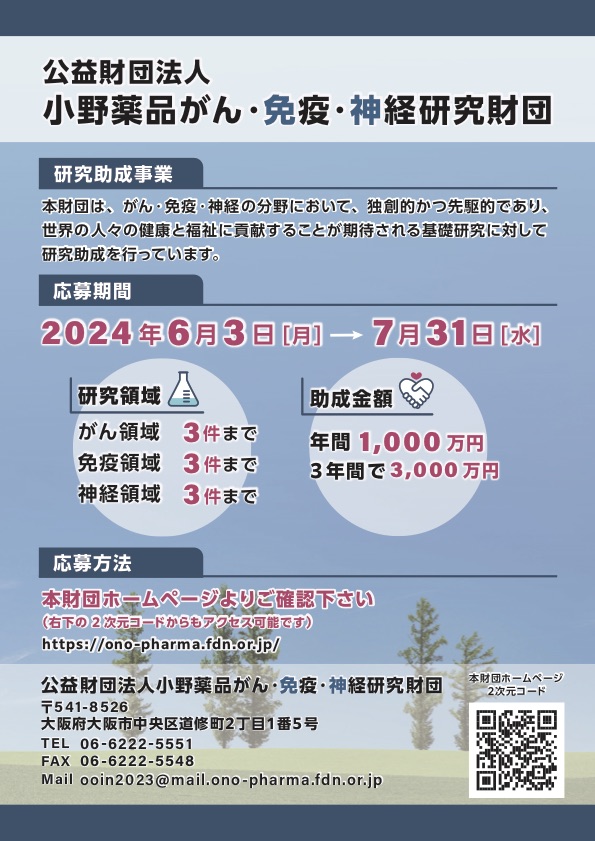 【研究助成募集開始】(小野薬品がん・免疫・神経研究財団)