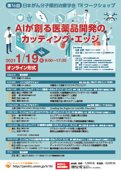 | 名称 | : | 第16回がんトランスレーショナルリサーチ(TR)ワークショップ AIが創る医薬品開発のカッティング・エッジ |